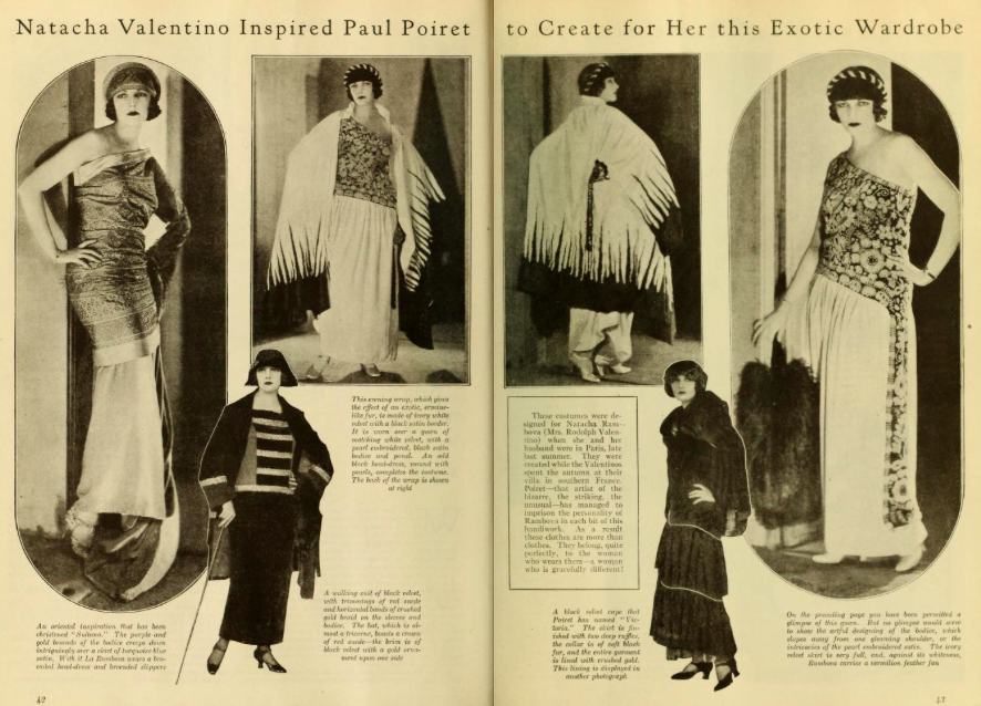 Her high-profile romance with one of Hollywood’s biggest stars made Rambova a celebrity in her own right, their short-lived love affair–and Rambova’s impeccable fashion sense–became the topic of international delight and intrigue. During a period when the chic simplicity of Coco Chanel’s designs were the height of fashion, Rambova possessed more extravagant tastes, turning to designer Paul Poiret for her wardrobe. According to Valentino, Poiret “was the one costumier in Paris best suited to Natacha’s style.” They both shared a love of the exotic East, the luxurious, the extravagant. Rambova’s Poiret-designed wardrobe was highlighted in the January 1924 issue of the popular film fan magazine Photoplay, featured below.