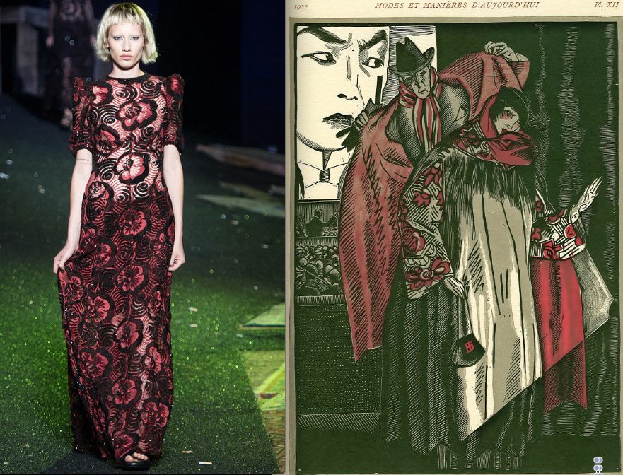 Looks like Marc Jacobs looked to the bold, black lines of wood engraved fashion plates for his 2014 Spring Ready-to-Wear line. The plate on right is by artist Fernand Siméon for Modes et manières d’aujourd’hui, a deluxe, limited-edition publication printed in 1922.