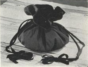 Altman’s bow-tipped drawstring bag made from black velvet and bengaline. Vogue, December 1, 1939, 136.