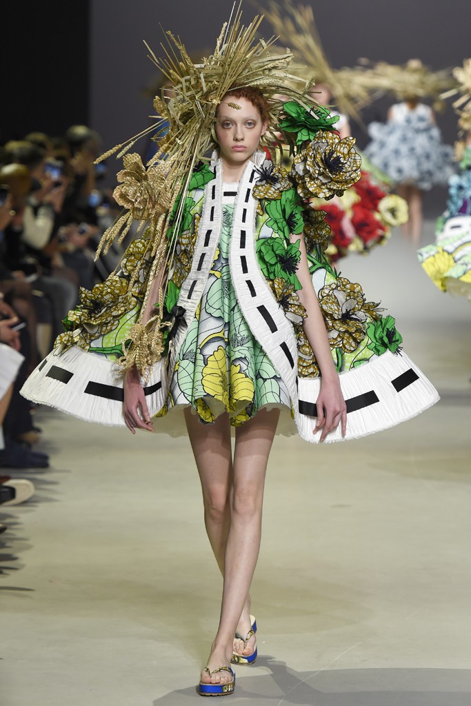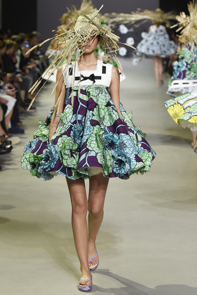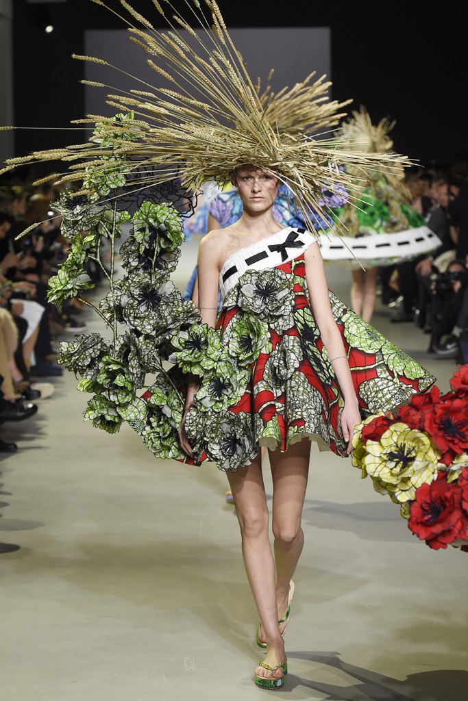 The Dutch wax cotton company Vlisco, who provided all of the fabric for the V&R collection, have been making and selling their version of wax resist-dyed fabrics to West Africa since 1846. Eager to cash in on local demand for colorful Indonesian batiks, Vlisco began to manufacture the fabrics en masse in the 19th century, cornering the market and solidifying a relationship that survives to this day. Instead of masking the fabric as just another ingredient in a garment’s construction, Viktor and Rolf made it the main focus of this collection. The first patterned dress of the show appeared colorless, a black-and-white coloring book waiting to be filled in. Color was added in each ascending look before it broke free in sunbursts of color with rich, beautiful combinations that are synonymous with the Vlisco aesthetic. Over-sized selvedges, normally hidden, edge some of the garments while large floral patterns descend from the fabric to form intricate three dimensional structures. Van Gogh is also present in the colorful ensembles, equally reminiscent of his celebrated landscape paintings, as are the over-sized straw confections that accompany each outfit. Viktor and Rolf evoked Van Gogh’s “raw energy” and even his madness in their unbridled floral structures, a point underscored by the collection’s accompanying soundtrack from the psychological thriller Rosemary’s Baby.