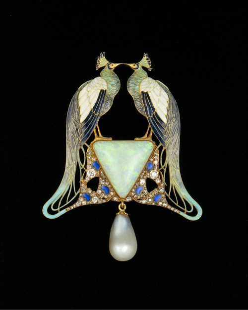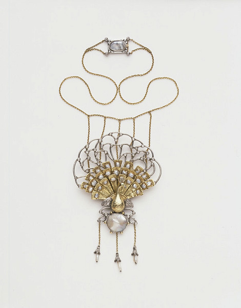 At the turn of the century, the peacock’s curvilinear form, proud stature, and expansive tail appealed to jewelry and accessory designers of the Art Nouveau and Arts and Crafts Movements.