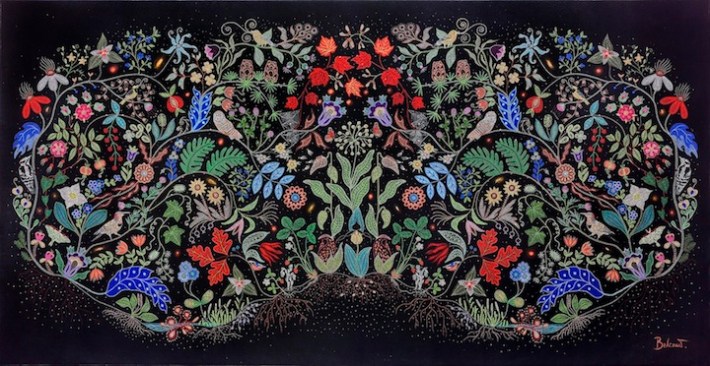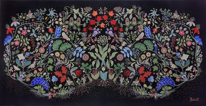 The intricate beaded works of her people are feats of exquisite artistry, representing the highest levels of craftsmanship. It is an art form cultivated over hundreds of years and is a source of immense cultural pride. Through her work Belcourt has attempted to “transfer the ‘beadwork’ to canvas, and in so doing, add commentary and expression within the work beyond the purely aesthetic. The plants within my paintings have become metaphors to parallel humanity.”[ii] In Belcourt’s “beadwork,”achieved by a series of small dots, sceneries of flowers and wildlife converge into colorful, magnetic feats of the imagination.